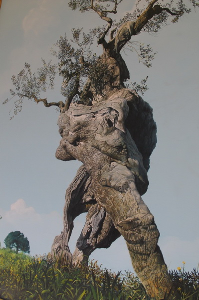 百味來廚藝學院入口處擺放千年橄欖老樹的照片。