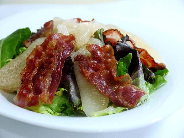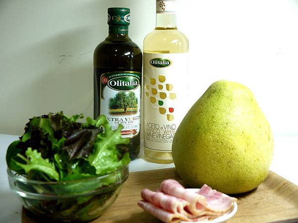 柚子、綜合生菜、培根、特級冷壓橄欖油、白酒醋、鹽巴、黑胡椒