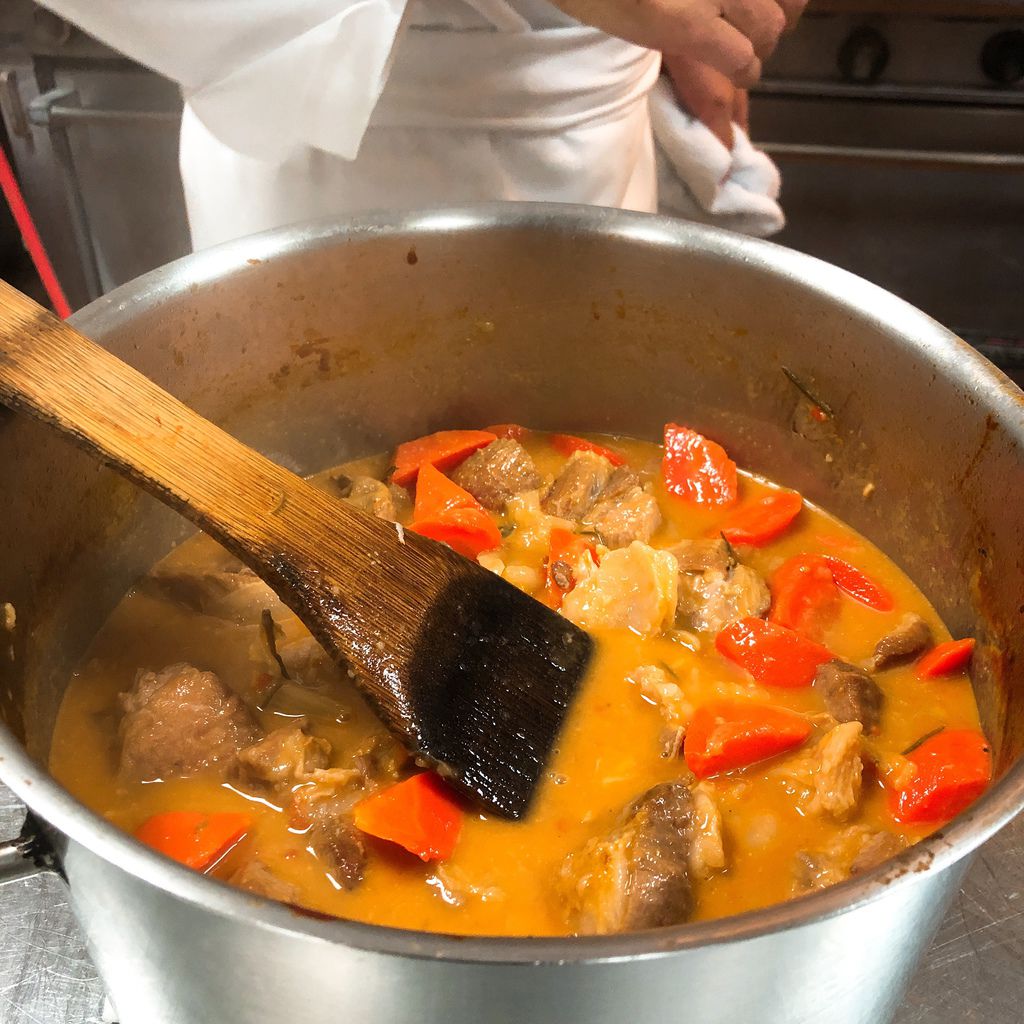 3. 將豬肩肉、Cantine Ronco白葡萄酒加入步驟2的鍋中,再加入ORO去皮整顆蕃茄、步驟1已煮沸的湯汁(水量需蓋過食材) 。