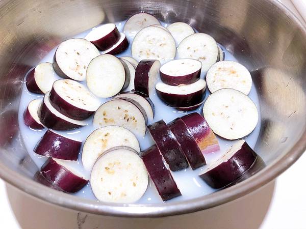 1. 長茄切圓片後泡牛奶水(水1:鮮奶1),可預防變黑。