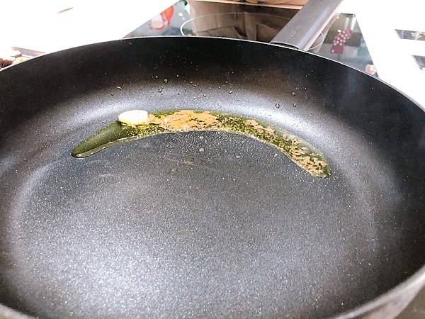 7. 取一個平底鍋,倒入奧利塔披薩(麵包)專用特級初榨橄欖油。